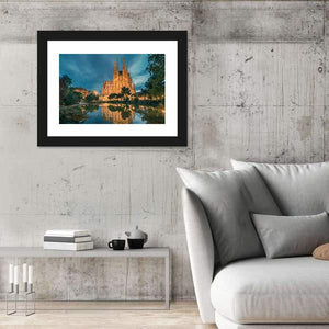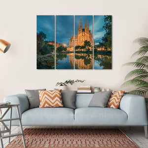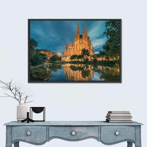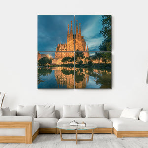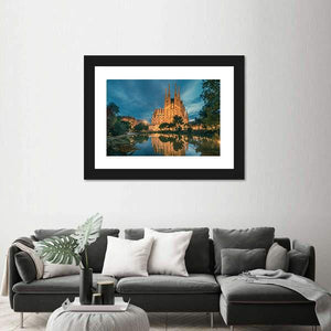 This striking canvas art captures the Sagrada Familia, reflecting majestically in calm waters. With its golden hues and tranquil atmosphere, it evokes awe and admiration, making it a beautiful addition to your wall decor.
