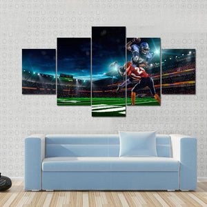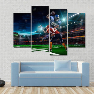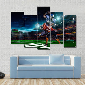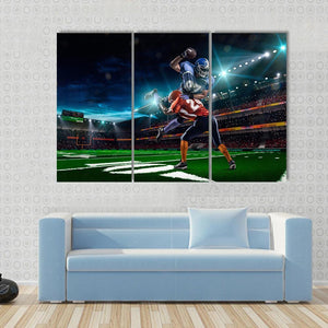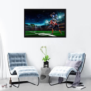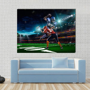 This dynamic artwork features a football player in blue tackling an opponent in orange, set against the dramatic backdrop of a stadium. The intense atmosphere is captured through vibrant colors and energetic movement, making it a striking addition to sports-themed decor.