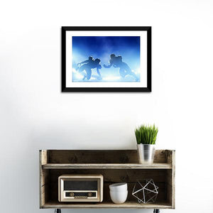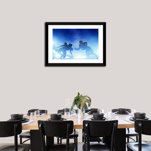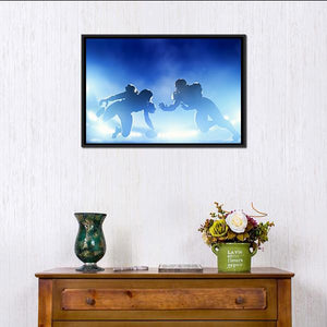 Capture the thrill of the game with this dynamic canvas art featuring football players in action. The intense and energetic scene conveys an atmosphere of excitement, highlighted by dramatic lighting and striking silhouettes against a blue and white backdrop.