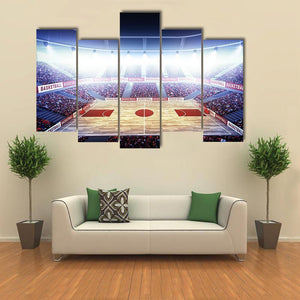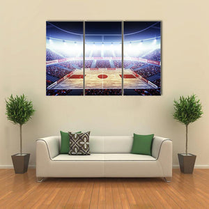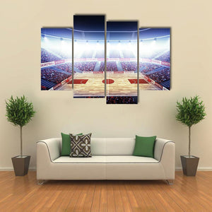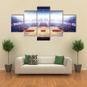 A wide-angle canvas view of a basketball court with stadium seating and a lively crowd, lit by arena lights and featuring a repeated "BASKETBALL" scoreboard. The red, brown, blue, and white palette gives the scene an energetic, dynamic mood that fits modern homes and living spaces.