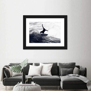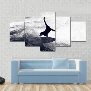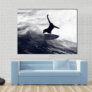 This dynamic canvas features a surfer captured mid-air against the powerful waves. The monochrome palette of black, white, and gray evokes a sense of action and energy, making it a striking addition to any modern decor.