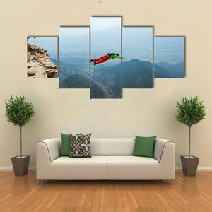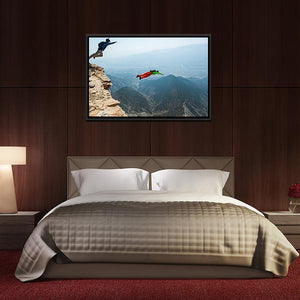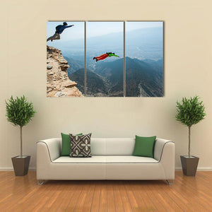 This breathtaking artwork captures wingsuit flyers soaring over majestic mountains and a winding canyon. The thrilling scene is rich with deep blues and greens, evoking a sense of adventure and vastness, perfect for modern decor.