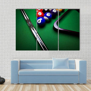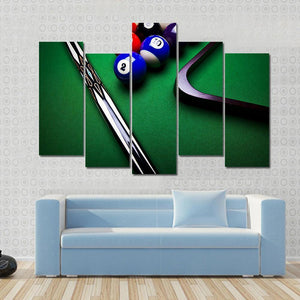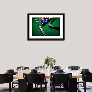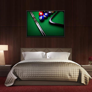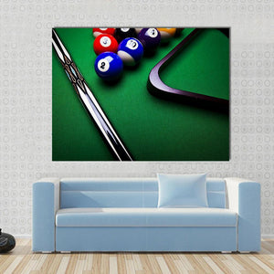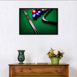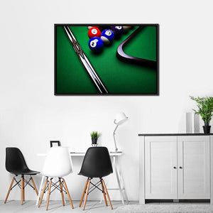 This modern canvas art captures the dynamic energy of billiard balls and a pool cue. The focused design showcases vibrant colors and geometric lines, making it a striking piece for any sports enthusiast.