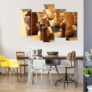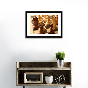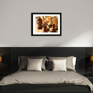 This canvas art features a close-up view of a chess board in action, highlighting intricately detailed wooden pieces set against a checkerboard pattern. The brown, cream, and black tones create a strategic and focused atmosphere, making it a compelling addition to your wall decor.