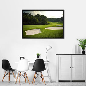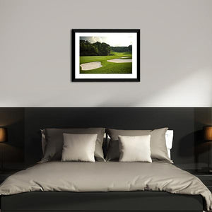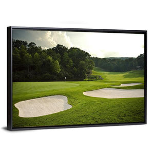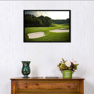 This landscape artwork captures the serene beauty of a golf course, featuring lush green grass, sand traps, and a partially cloudy sky. The natural palette of greens, whites, blues, and browns creates a peaceful atmosphere, perfect for enhancing your space.