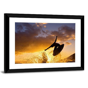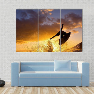 This canvas wall art captures the exhilarating moment of a surfer riding an ocean wave at sunset. With vivid shades of orange and yellow against dynamic blues, it brings an energetic vibe to any space.