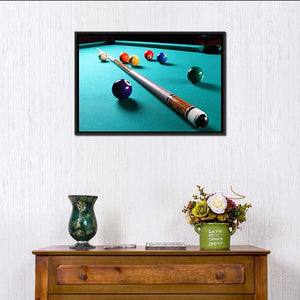 This canvas art features a close-up of a billiard table laden with colorful balls and a cue, creating a focused and still atmosphere. The vibrant palette of teal, purple, and orange captures the essence of the game, making it a striking addition to your space.