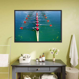 This vibrant canvas art captures eight rowers in perfect sync, paddling through shimmering green water. The dynamic composition and lively colors evoke a sense of energy and focus, making it an inspiring addition to any space.