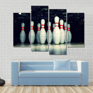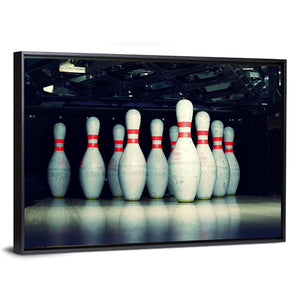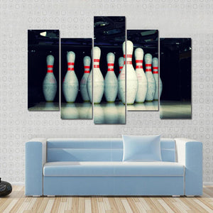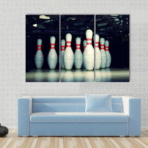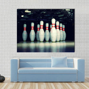 This canvas art captures a close-up view of bowling pins, showcasing their energetic and focused vibe. The modern graphic style and striking red bands contrast beautifully with the white and grey palette, making it an eye-catching piece.