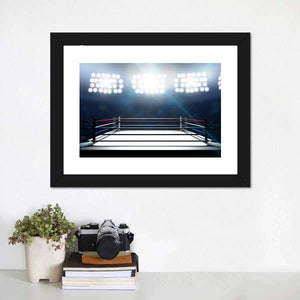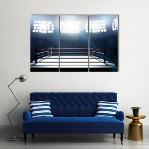 A modern canvas print of a boxing ring under bright spotlights, with red, white and blue ropes and subtle lens-flare effects. The centered composition and strong perspective give the scene depth and a dramatic, intense mood—suitable for modern homes and sports-themed rooms.