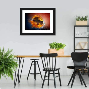 A hockey puck engulfed in flames and a burst of water creates an intense, energetic image. This abstract, modern canvas print brings bold color and motion to game rooms, sports-themed spaces, or contemporary homes.