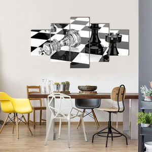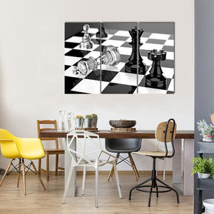 This striking art piece features a dramatic chess scene with black and white pieces strategically arranged, highlighted by a fallen silver king. Its modern, minimalist style adds an intense touch to any room.