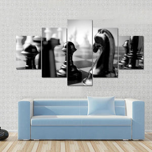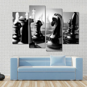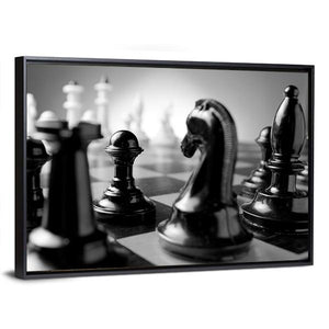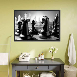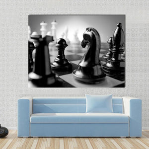 This canvas features a close-up of chess pieces—knights, pawns, and bishops—set against a dramatic, monochromatic background. The high-contrast black, white, and grey palette creates a focused atmosphere, making it an ideal addition to any modern decor.