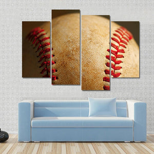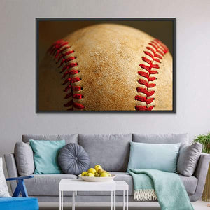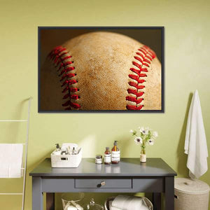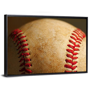 This canvas art captures an extreme close-up of a baseball, showcasing its detailed stitching against a backdrop of rich brown and red tones. It brings a focused, sporty vibe that is perfect for any sports enthusiast.