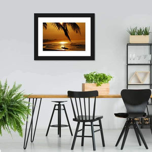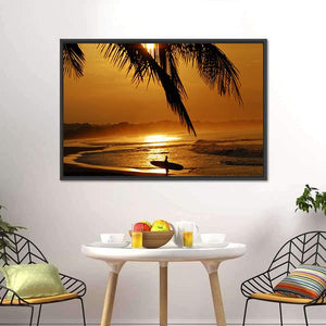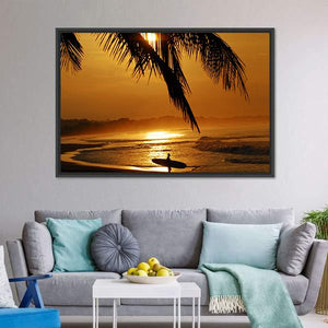 This canvas wall art captures a serene sunset scene featuring a surfer silhouetted against the vibrant colors of the ocean. Palm fronds elegantly frame the top, adding an adventurous and tranquil feel that complements beach and sports themes.