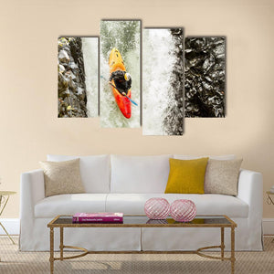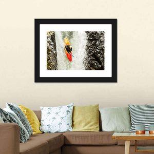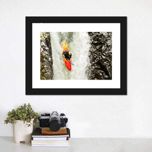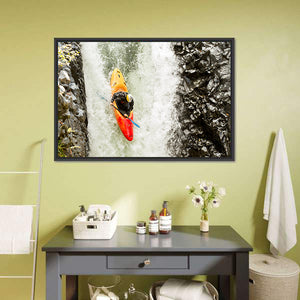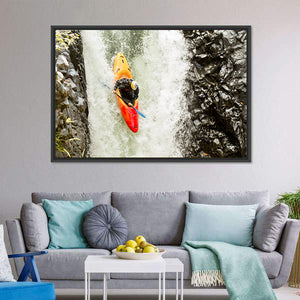 This dynamic canvas art captures an exciting top-down view of a bold kayaker navigating a waterfall. With its vibrant palette of red, yellow, and green, it brings a sense of adventure to any space.