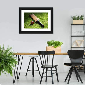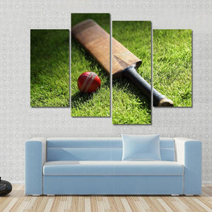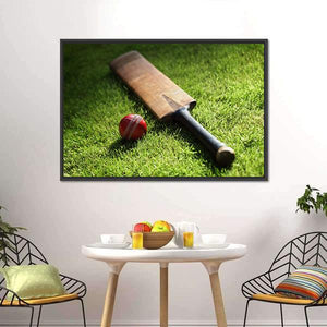 This canvas features a close-up of a cricket bat and ball nestled in lush green grass. The realistic details, including the red ball's stitching and the bat's dark handle, create a natural and peaceful vibe, making it a thoughtful addition to any sports lover's space.