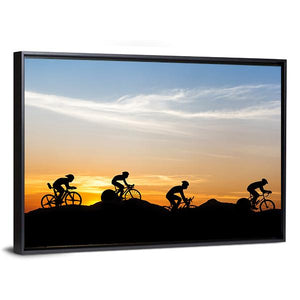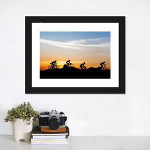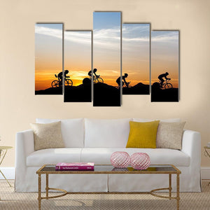 Four cyclists are silhouetted on a mountain ridge at sunset, with orange and blue skies and touches of black and yellow that create a dynamic yet serene atmosphere. The modern silhouette composition fits well with contemporary home decor and adds an adventurous, sporty note to living rooms or hallways.