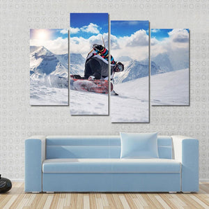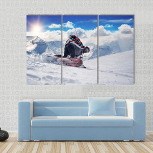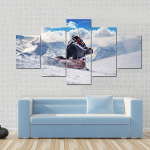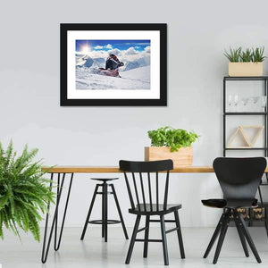 This dynamic canvas art captures a snowboarder performing a thrilling trick against a backdrop of majestic mountains. The realistic style and vibrant colors of blue, white, gray, and orange evoke an exhilarating winter vibe, making it a perfect addition to your décor.