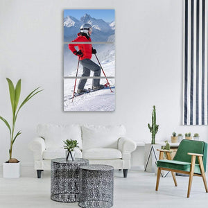 A realistic mountain scene showing a female skier moving through snowy peaks, with a red ski jacket, silver helmet, and red poles. The rule-of-thirds composition and a gray-white-blue winter palette create an active, adventurous mood. Suits modern rooms and living spaces that want a sporty, nature-inspired accent.