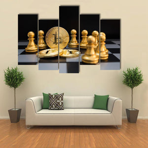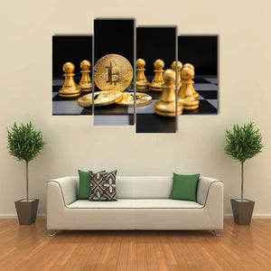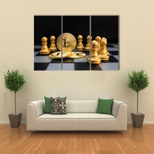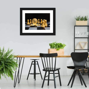 This canvas print pairs gold Bitcoin coins with arranged chess pawns in a close-up study of strategy and value, calling attention to the bitcoin symbol. Black, white and grey contrasts and a rule-of-thirds composition create visual depth and a modern, strategic mood. The piece suits modern home decor.