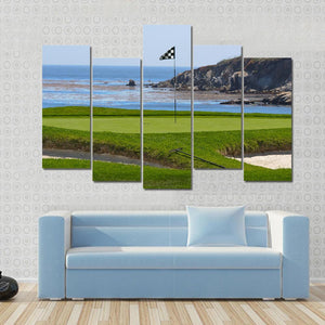 This canvas art captures a serene golf course adjacent to the ocean, framed by coastal cliffs. Its bright colors and realistic style create a peaceful atmosphere, perfect for enhancing your living space.