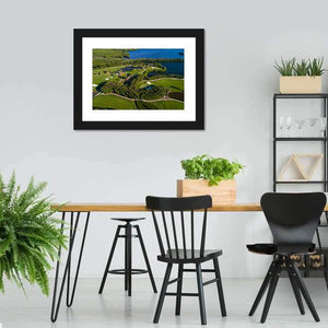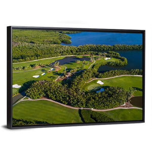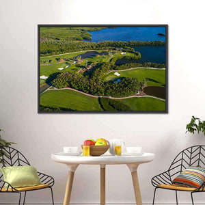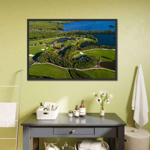 This realistic canvas shows an aerial view of a golf course with water and trees, winding paths, white sand traps, and manicured greens. Rendered in greens, blues, browns and whites, the scene feels serene and spacious and suits modern room decor and home wall art.
