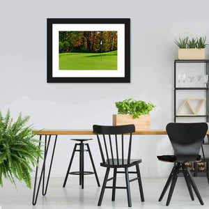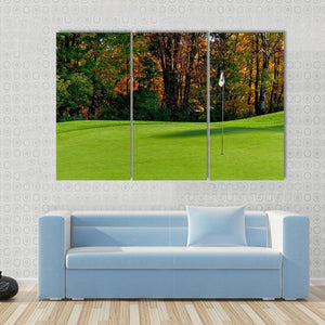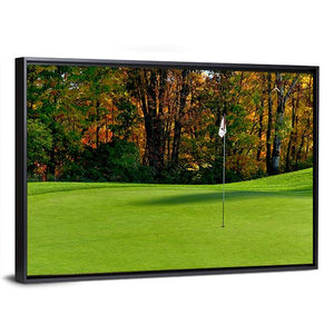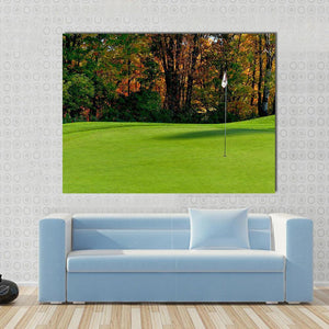 Capture the serene beauty of a golf course in autumn with this canvas wall art. Featuring vibrant fall foliage and a classic white flag, it's perfect for nature lovers and golf enthusiasts alike.