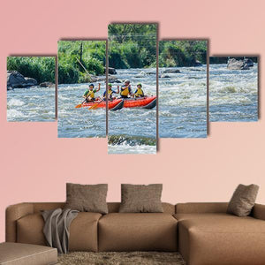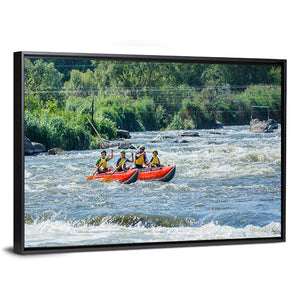 Family Rafting in River shows four people in two rafts on a river, captured in a realistic, action style. The rule-of-thirds composition and a palette of blue, green, orange and brown create an active, adventurous atmosphere. Suited to modern homes and family rooms as room decor.