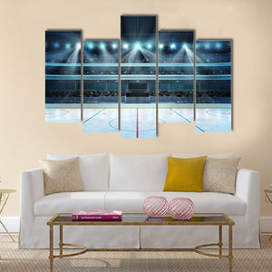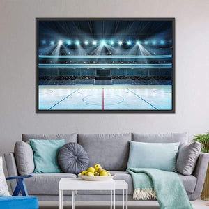 A centered, eye-level view of an ice hockey rink under bright spotlights, showing blue ice with the red center line, face-off circles, and dark stadium seating. Rendered in a photorealistic style, the print conveys an energetic, dramatic, focused mood and suits modern home and room decor.