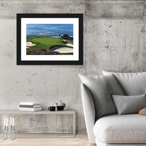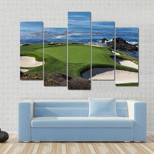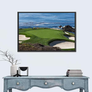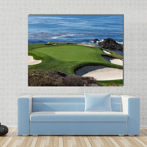 This serene landscape features the iconic Pebble Beach Golf Course, showcasing lush green fairways and the tranquil ocean. The picturesque scene, highlighted by a flag on the green, brings a calming atmosphere that fits beautifully in any space.