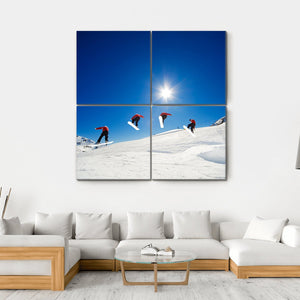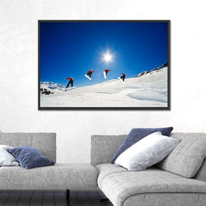 This vibrant canvas artwork captures the exhilarating moment of a snowboarder soaring over a jump. With dynamic action and a striking palette of blue, white, red, and yellow, it brings an energetic vibe to any space.