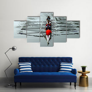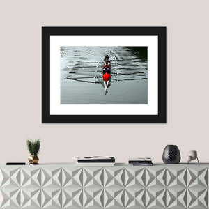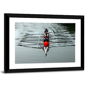 An overhead view captures an eight-rower team in a single boat, oars extended and wake trailing in a linear motion across gray water. Rendered in a realistic, action-shot style with gray, white, red, and black tones, the piece carries a focused, determined aquatic mood and suits modern homes or workplace meeting areas.