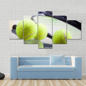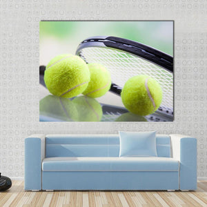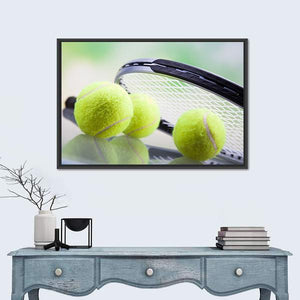 This canvas features a close-up of a tennis racket and three tennis balls, showcasing a modern and sporty vibe. The blend of green, white, black, and grey colors adds an active and focused atmosphere, perfect for enhancing your wall decor.