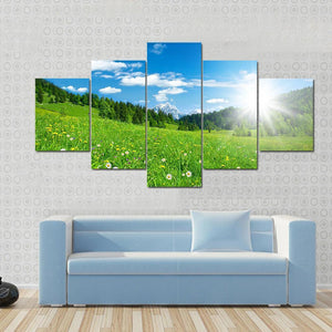 This canvas art captures a serene landscape filled with vibrant fields of flowers under a bright sky. Sunlight bathes the peaceful scene, highlighting snow-capped mountains and lush pine trees, bringing a cheerful touch to any space.