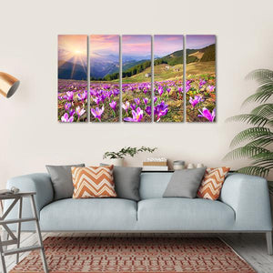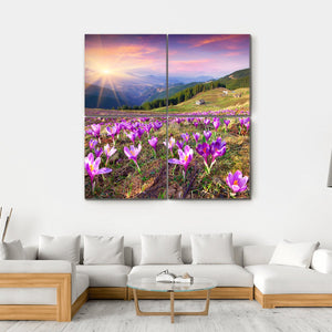 This canvas features the serene beauty of crocus flowers blooming amidst rolling hills and distant mountains. An inviting sunrise casts warm hues of purple, pink, and orange across the sky, creating a peaceful atmosphere perfect for any space.