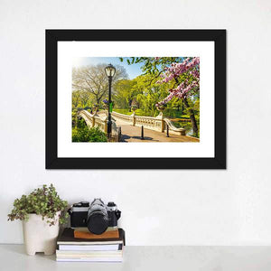 This canvas art captures the tranquil beauty of Bow Bridge in Central Park. Featuring blooming trees and reflective water, it creates a serene atmosphere perfect for any space.