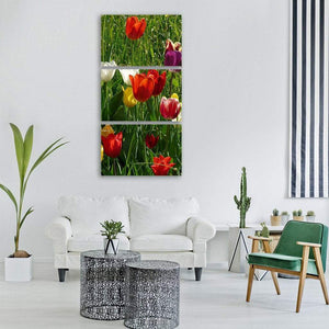 Colorful tulips and spring grass in a close-up composition create a vibrant, cheerful, and fresh atmosphere. The floral botanical print highlights red, white, yellow, purple, and green tones, a lively choice for modern and nature-inspired rooms.