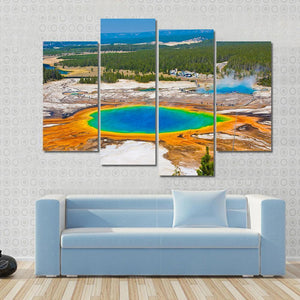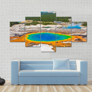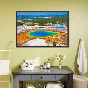 Experience the vibrant colors of Grand Prismatic Spring at Yellowstone National Park with this stunning canvas wall art. The artwork captures the awe-inspiring natural beauty of the geothermal area, featuring vivid hues of blue, green, orange, and yellow—all set against a backdrop of distant hills and coniferous trees.