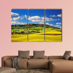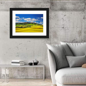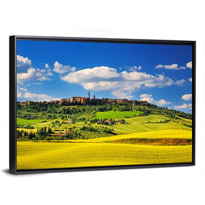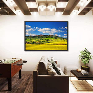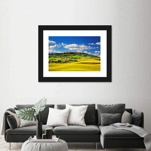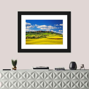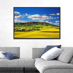 Pienza Medieval Village In Summer shows an Italian village among rolling hills and summer fields with a realistic, natural look. Fluffy white clouds and distant village buildings set a peaceful, serene, idyllic mood that fits living rooms, studies, or entryways.