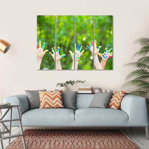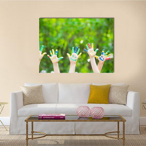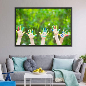 This playful canvas art features children's hands joyfully adorned with colorful finger paints. The cheerful composition evokes a sense of creativity and warmth, making it a wonderful addition to any room that celebrates fun and imagination.