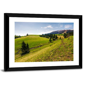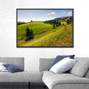 This nature-photography canvas shows grassy hills, pine trees, distant snow-topped peaks and a winding path along the Borzhava Mountain Ridge. The scene feels peaceful and serene, with green and blue tones that suit modern or nature-inspired living rooms and bedrooms.