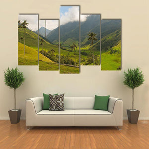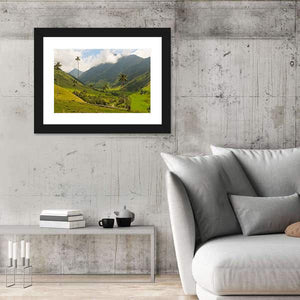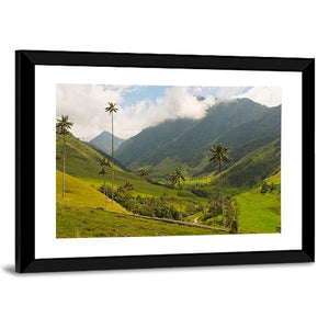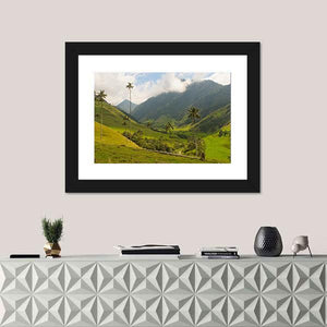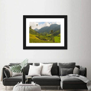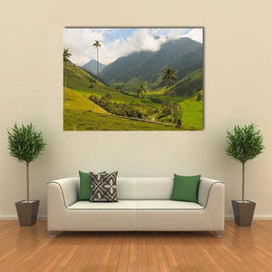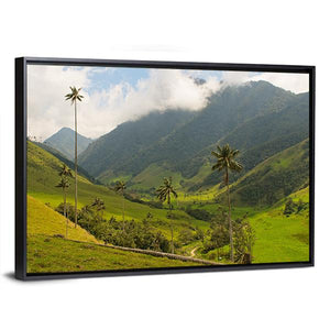 This serene canvas features the majestic wax palm trees of Cocora Valley, surrounded by lush green hills and mountains. The soft blues and whites of the clouds add to the peaceful atmosphere, making it a perfect piece for a nature-inspired décor.