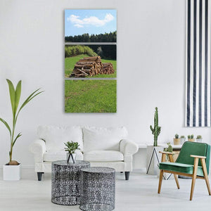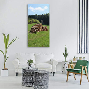 This peaceful landscape shows a pile of logs in a spring meadow, with a grassy field, a forest edge, and a sky dotted with clouds. The green, brown and blue palette and rustic, natural mood work well with nature-themed or rustic decor.