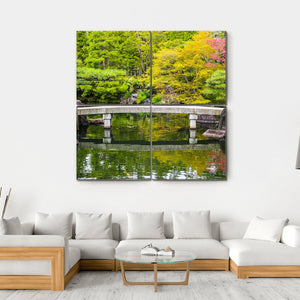 This canvas art features a serene pond scene with a stone bridge, surrounded by lush trees and colorful foliage. The peaceful atmosphere invites tranquility into any space, making it a fitting addition for nature lovers seeking a calming touch to their decor.