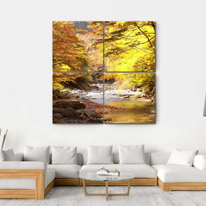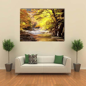 This captivating artwork features a serene stream flowing through a peaceful forest adorned with vibrant autumnal leaves. The warm palette of yellow, green, and brown creates a tranquil atmosphere, perfect for enhancing your living space.