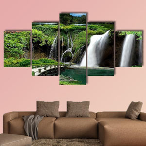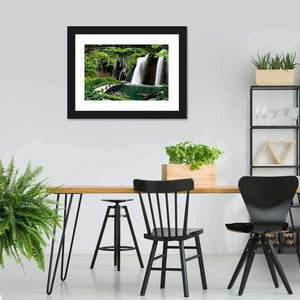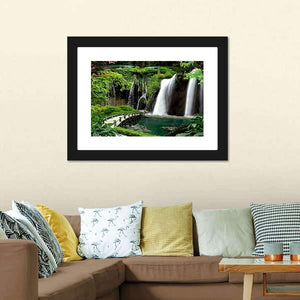 A realistic scene of cascading waterfalls, streams and a white-railing bridge set among dense, lush greenery that creates a serene, tranquil, majestic mood. The cool green, blue, white and brown palette brings a calm, nature-focused feeling that suits modern homes and nature-themed rooms.
