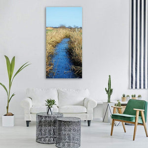 Field Mark Dig In Winter depicts a narrow blue canal lined with reeds beneath a clear winter sky, rendered in a realistic landscape style. The blue, gold, green, and white palette creates a calm, natural mood that suits modern or nature-inspired rooms.