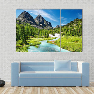 This canvas features a serene mountain landscape complete with a clear blue river and lush green trees. The majestic scene evokes a peaceful atmosphere, making it an inviting addition to your wall decor.