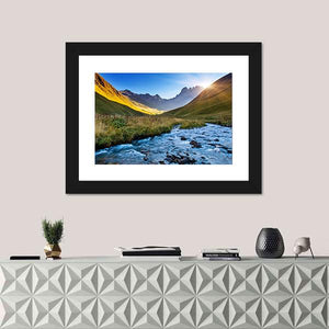 This canvas art features a serene mountain river scene, highlighting sunlight filtering through majestic mountains and smooth rocks in a tranquil stream. The vibrant greens and blues evoke a peaceful summer day, making it a beautiful addition to any wall.